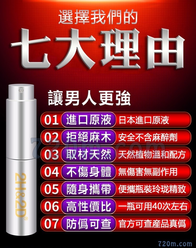 2h2d持久液作用原理:白金版持久液通過產品作用于私處海綿體組織,會一定程度上舒緩私處敏感細微神經反應,降低末梢神經感性,從而在愛愛時候提高射精閾值,使皮下神經延緩像向大腦傳送射精命令,從而達到您的需求。2H2D持久液不含酒精和刺激性的化學成分,使用後不麻木,有效延長30-60分鐘。相比口服延時藥物,外用持久液更健康,不擔心副作用与飲食衝突等,更安全使用。適合不喜歡口服持久藥物必利勁反而更喜歡外用延時噴霧,持久液的用戶使用。