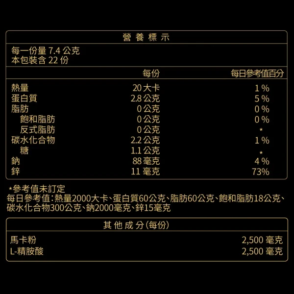 馬卡粉、L-精胺酸、檸檬酸鈉、香料、DL-蘋果酸、檸檬酸鈉、葡萄糖酸鋅、蔗糖素(甜味劑)、醋磺內酯鉀(甜味劑)、西伯利亞人參(含西伯利亞人參萃取物、麥芽糊精)、蛹蟲草子實體粉末(Cordyceps militaris, 固態培養)、透納葉萃取粉末(含透納葉萃取粉、糊精)。 |