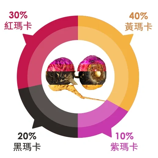 大研精心挑選擁有40%黃瑪卡+30%紅瑪卡+20%黑瑪卡+10%紫瑪卡的黃金比例組合,包含多種瑪卡的營養價值,達到快速滋補強身的作用。
