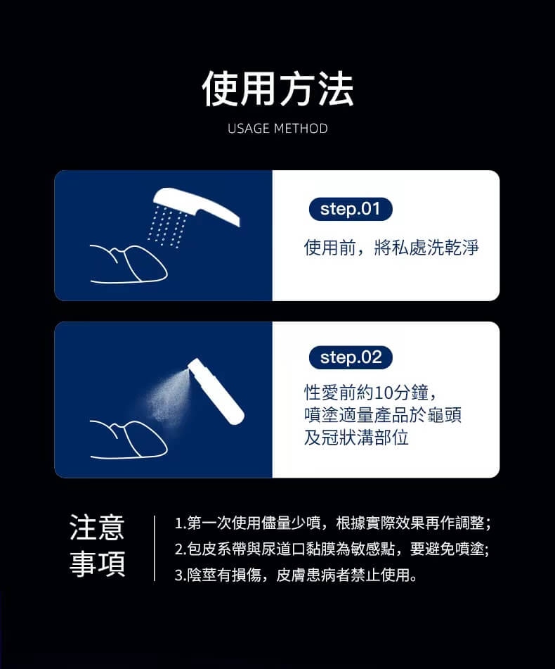 2.請在房事前10-20分鐘取出川井噴劑,噴塗在龜頭冠狀溝處,然後輕輕按摩3分鐘,等液體充分吸收後即可進行房事。