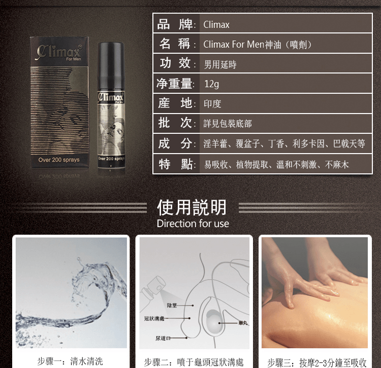 【產品名稱】印度神油 Climax 、Climax持久液、 Climax延時噴霧