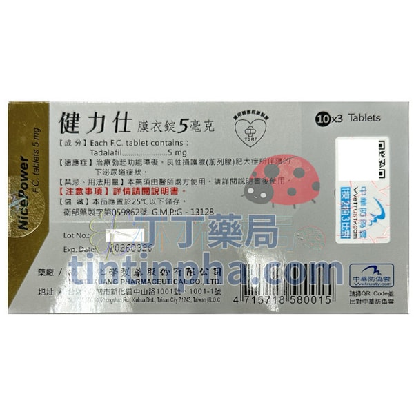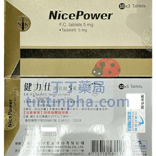 | 商品名 | NicePower F.C. Tablets 5mg | 藥品許可證 | 衛部藥製字第059862號 | ||