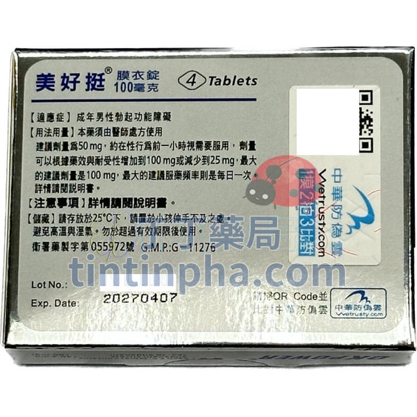 | 中文名 | 美好挺膜衣錠 | 健保局藥理類別 | Sildenafil,第五型磷酸二酯酶抑制劑,(PDE5) | ||