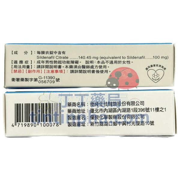 | 學名 | Sildenafil | 生產藥廠 | 優良化學製藥股份有限公司 | ||