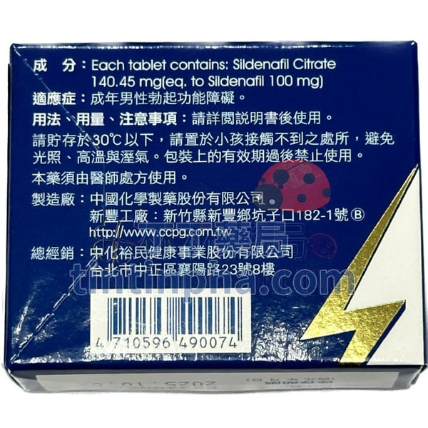 | 學名 | Sildenafil | 生產藥廠 | 中國化學製藥股份有限公司新豐工廠 | ||