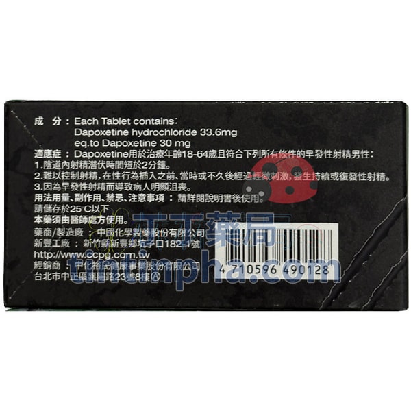 | 學名 | Dapoxetine | 生產藥廠 | 中國化學製藥股份有限公司新豐工廠 | ||