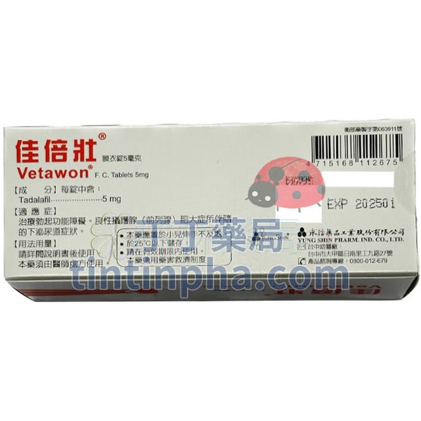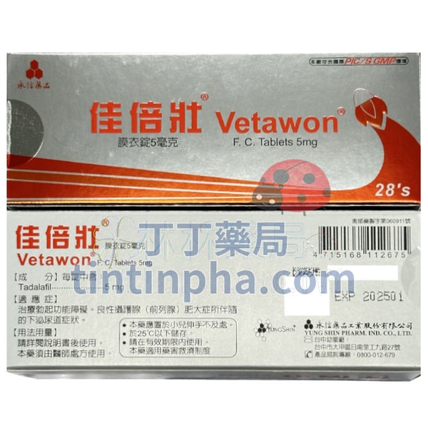| 英文名 | Vetawon F.C. Tablets 5mg | 規格 | 28錠/盒(Box) | ||